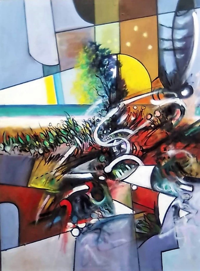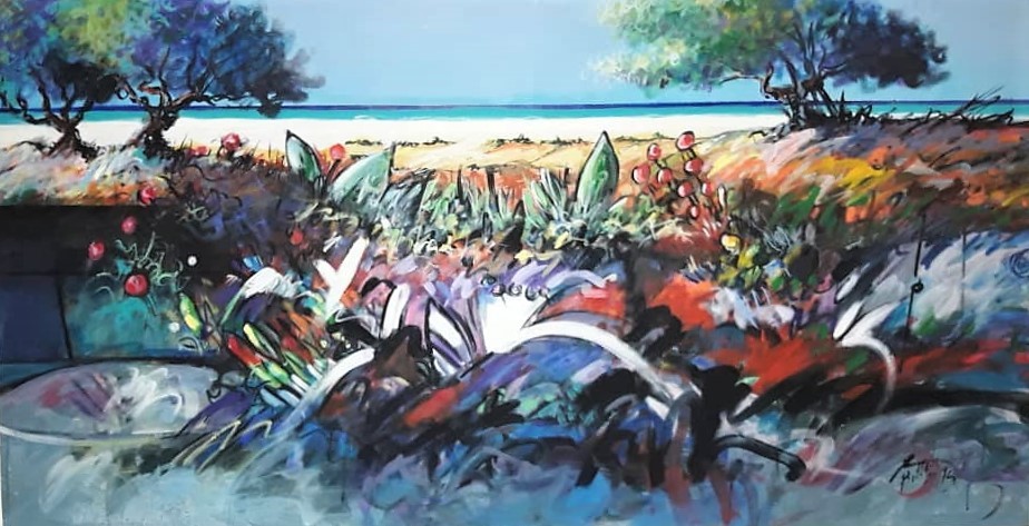 Simón: Llevo años buscando el paisaje, el paisaje marino, pero romper con trazos, con líneas, con símbolos, con… la geometría. Esa es la búsqueda, de tantos años que tengo siempre va a ver en mi obra un horizonte de luz que es el mar, porque vivo en un pueblo que es de mar. Estoy a la orilla de Mar Caribe y desde ese cerro que es mi taller-casa visualizo el Mar Caribe. Pero yo quiero, como ya existen todos «los ismos» dentro del arte, como lo es el impresionismo, el realismo, cubismo… quiero buscar una tendencia que si dios quiere y seguimos en esta búsqueda trabajando, vamos a buscar un bellorinismo que es romper el paisaje a la manera y de los colores que estoy marcando en mi obra.
