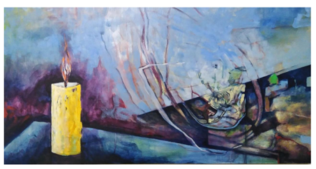 Luis: Bueno justamente esa obra pertenece a un tercer periodo pictórico que tengo y es mi corriente no figurativa o mi corriente abstracta, pero que está relacionado con los insectos. Y lo que yo pinté es un insecto que está tratando de acercarse a la luz de la vela, como cuando tú estás solo en el campo prendí la vela y se acercan las polillas.
