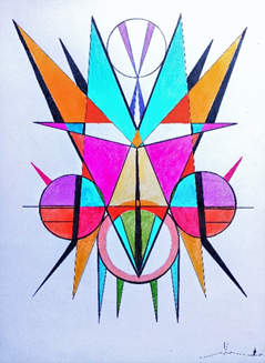Felipe busca y se conecta con los materiales, en ilustraciones figurativas y otras obras abstractas donde persisten la simetría y la composición de colores.